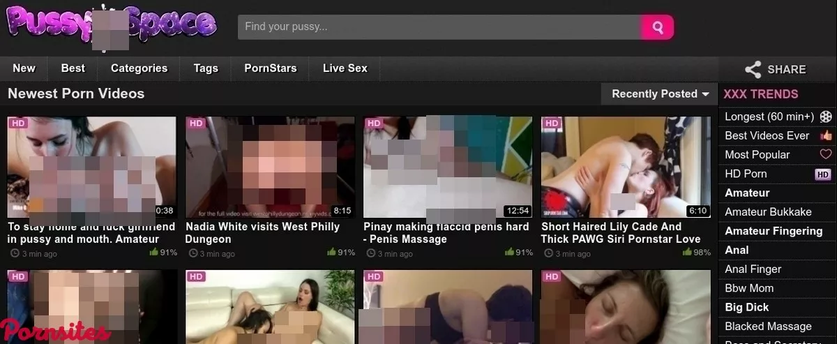 It's called 'XXX Trends,' and it's found on the right sidebar of the homepage. It may seem like an afterthought on the homepage, but it's not. Look at the sidebar and notice what other types of content viewers enjoy watching the most on Pussy Space. People can click on items such as ‘Longest videos (60+ min),’ ‘HD videos,’ ‘best videos ever,’ etc. It’s a nice assortment of convenient search options that go a long way to making Pussy Space even more convenient to use!Can browse by pornstar