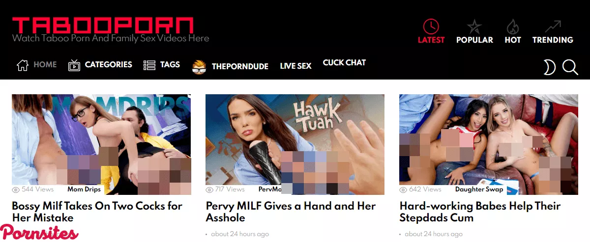Just like the name suggests, TabooTube is a free porn tube dedicated to taboo porn, in this case, incest. They have a massive index of porn revolving around family-related scenarios with stepmoms fucking stepsons, dads fucking stepdaughters, MILFs